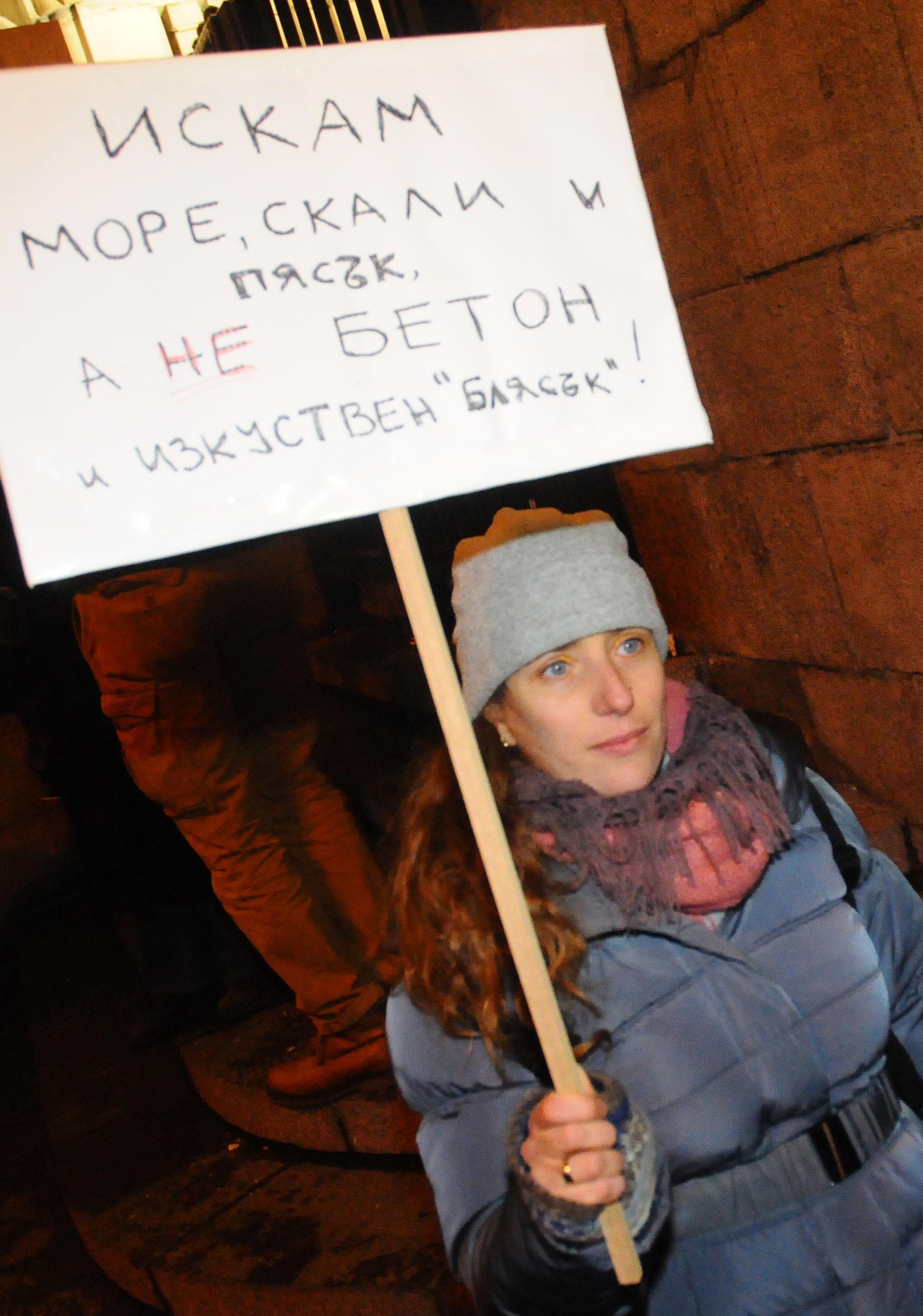 На протеста се раздават брошура с химна на Странджа - песента „Ясен месец веч изгрява". Има един голям плакат с надпис: „Морето не е частно, не ви е ясно". Към природозащитниците се присъедини протестът срещу правителството на Пламен Орешарски със скандирания „Искаме природа, не искаме бетон".