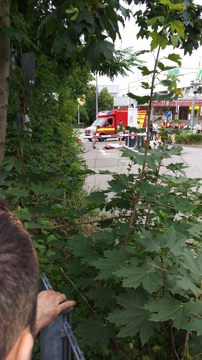 Снимка в Туитър показва пристигането на линейка. На нея се вижда лежащ на асфалта човек.