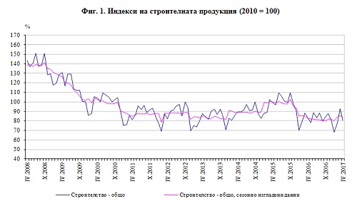 През април 2017 г. индексът на произведената строителна продукция, изчислен от сезонно изгладени данни, е под равнището от предходния месец, като продукцията от сградното строителство намалява с 1.8%, а от гражданското/инженерното строителство - с 1.7%