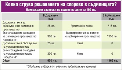Освен това има възможност за присъждане на по-малки по размер юрисконсултски възнаграждения, което намалява значително разходите по делото. Така например съвсем основателно омбудсманът Мая Манолова посочва, че много често на осъдени потребители се налага да плащат 800 и 1000 лв. за дълг от 100 лева. Такива са размерите, присъждани от държавните съдилища. В арбитражните съдилища обаче за същия дълг от 100 лв. плюс таксата и юрисконсултските възнаграждения сумата за плащане едва ли ще надвиши 170-200 лева. Във всеки съдебен спор има една загубила и една спечелила страна, но когато осъдената страна заплати разноските за воденото производсто, то винаги от огромно значение е и колко допълнително ще бъдат заплатените допълнителни разноски. Тогава остава въпросът в кой съд е по-добре да се води съдебното производство - в арбитражния съд с 200 лв. допълнителни разноски, или в държавния съд с 1000 лв. допълнителни разноски за 100 лв. задължение.