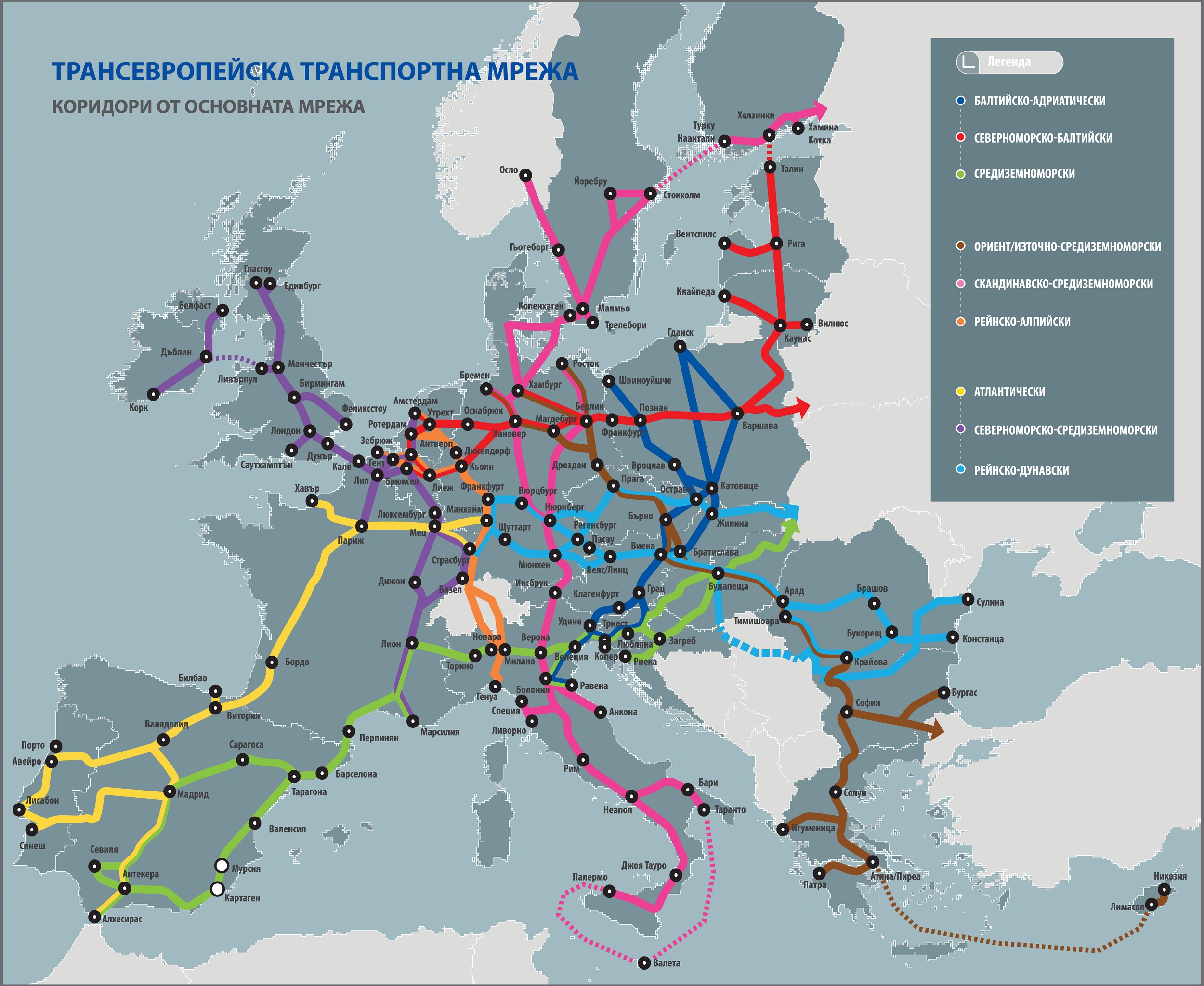 Коридор „Ориент/Източно-Средиземноморски" започва от германските пристанища Бремен, Хамбург и Росток, минава през Чехия и Словакия с разклонение, което пресича Австрия, и продължава през Унгария към румънското пристанище Констанца. Друго разклонение е от Румъния през Видин към гръцките пристанища Солун и Пирея, към Истанбул и Бургас. През юни, 2016 г., в Ротердам, 8-те държави подписаха Декларация за развитието на коридора.
