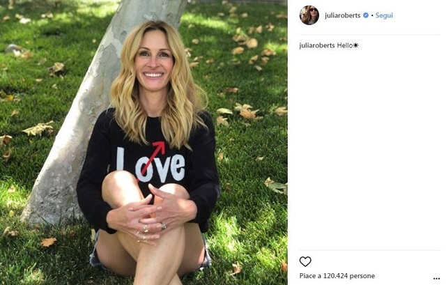 Изпълнителката на главната роля в култовата романтична комедия "Хубава жена" публикува своя снимка, седнала в тревата с дънкови къси панталонки и с черна фланелка с надпис "Love". Текстът, съпровождащ фотоса бе повече от лаконичен - "Hello".