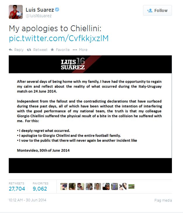 /КРОСС/ Нападателят на Уругвай Луис Суарес се извини на италианския защитник Джорджо Киелини, че го е ухапал по време на мача от третия кръг на груповата фаза на Световното първенство. Извинението уругваецът поднесе чрез профила си в Twitter.