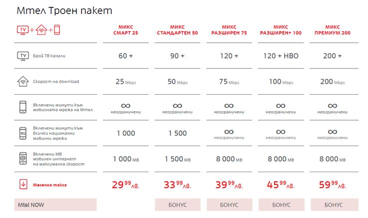 Mtel NOW ще е безплатна при закупуването на 4 от 5-те тройни пакета, предлагани от Мтел. Потребителите ще могат да получат достъп до Mtel NOW, ако вземат една от комбинираните оферти Микс Стандартен 50, Микс Разширен 75, Микс Разширен+ 100 или Микс Премиум 200. Тройните пакети предлагат над 200 ТВ канала, до 200 Mbps интернет, неограничени минути за разговори и 4G мобилен интернет. Повече информация може да видите в таблицата по-долу.