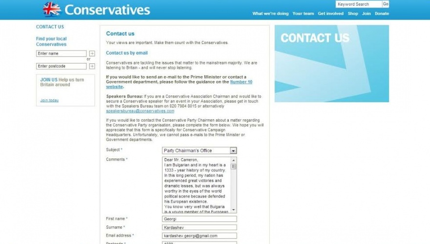 /КРОСС/ Българинът Георги Кардашев изпрати писмо, чрез информационната система на сайта на Консервативната партия във Великобритания, до министър-председателя Дейвид Камерън.