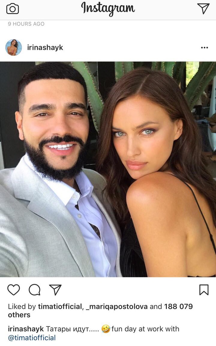 /КРОСС/ Най-голямата руска музикална звезда Тимати и един от най-известните световни супермодели Ирина Шейк изненадаха своите почитатели, споделяйки изключително любопитна фотография в Instagram, на която са в „опасна близост". Това мигновено предизвика медиен отзвук не само в северната ни съседка, но и в цял свят. Още повече, че и двамата едновременно са споделили въпросния кадър.