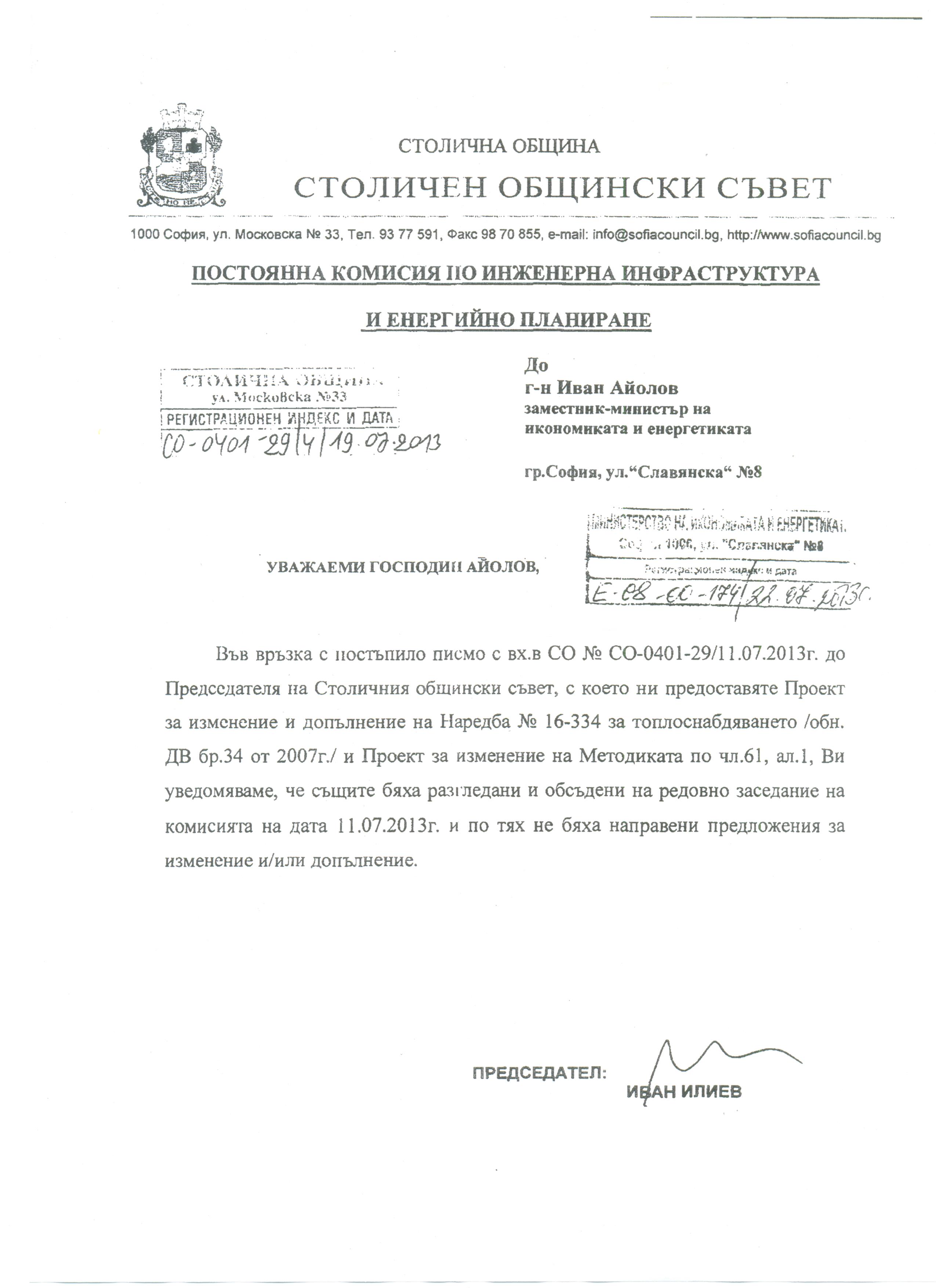 На 19.7.2013 г. предложеният от Министерство на икономиката и енергетиката текст на Наредба № 16-334 за топлоснабдяването е съгласуван без забележки от Постоянната комисия по инженерна инфраструктура и енергийно планиране към Столичния общински съвет, принципал на най-голямата топлофикация в страната и инициатор на преобладаваща част от направените промени.