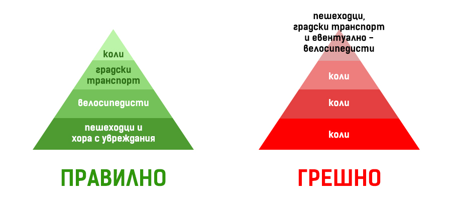 Столична община проектира за автомобилите. Което е жалко, защото те са на върха на пирамидата на устойчивия транспорт, т.е. те би трябвало да са най-малко взискателните към градската среда форми на транспорт. Ресурсите на един устойчиво развиващ се град се насочват към безконфликтно движение първо за пешехоците и хората с увреждания, после за велосипедистите, следвани от градския транспорт.