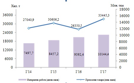 Извършената работа нараства с 8.0% спрямо същия период на 2016 г. и достига 10 144.4 млн. ткм (фиг. 1), като увеличението се дължи на по-голямото средно превозно разстояние при вътрешните превози.