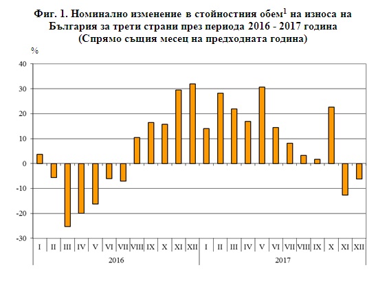 През декември 2017 г. износът на България за трети страни намалява с 6.2% спрямо същия месец на предходната година и е в размер на 1 596.5 млн. лева.