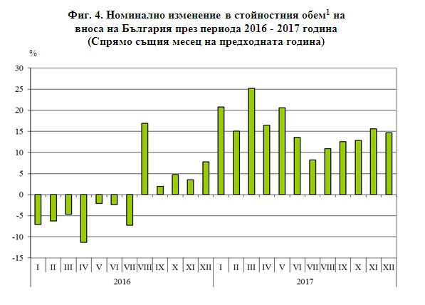 През декември 2017 г. общият внос се увеличава с 14.7% спрямо същия месец на предходната година и възлиза на 5 326.3 млн. лева.