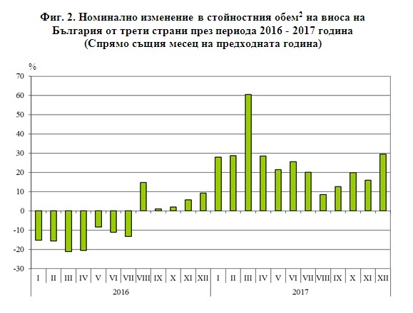През декември 2017 г. вносът на България от трети страни нараства с 29.6% спрямо същия месец на предходната година и е в размер на 2 045.8 млн. лeвa.
