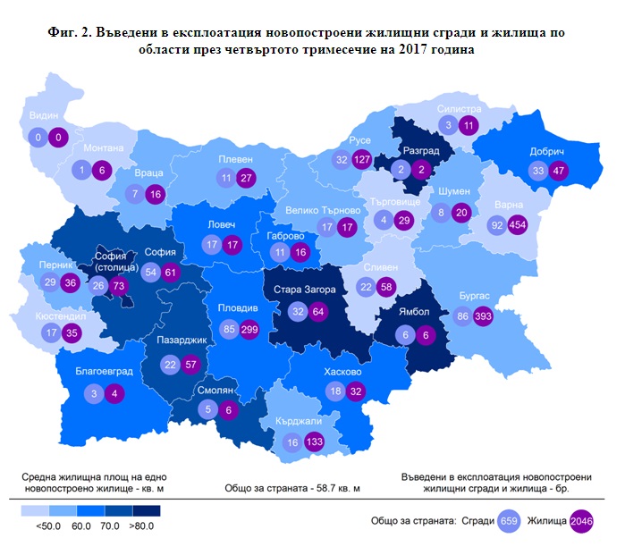 Най-много жилищни сгради са въведени в експлоатация в областите Варна - 92 сгради с 454 жилища в тях, Бургас - 86 сгради с 393 жилища, и Пловдив - 85 сгради с 299 жилища