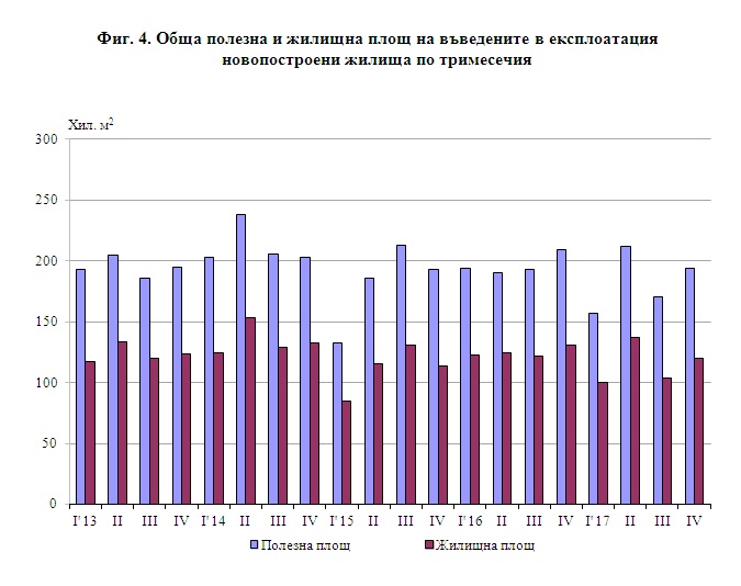 Общата полезна площ на всички новопостроени жилища през четвъртото тримесечие на 2017 г. е 194.0 хил. кв. м, или със 7.1% по-малко в сравнение със същото тримесечие на 2016 г., а жилищната площ намалява с 8.3% до 120.1 хил. кв. метра (фиг. 4).