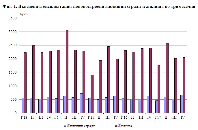 /КРОСС/ По предварителни данни на Националния статистически институт броят на въведените в експлоатация жилищни сгради през четвъртото тримесечие на 2017 г. е 659, а новопостроените жилища в тях са 2 046. Спрямо четвъртото тримесечие на 2016 г. сградите са с 34 повече, или с 5.4%, докато жилищата в тях намаляват с 354, или с 14.8% (фиг. 1).
