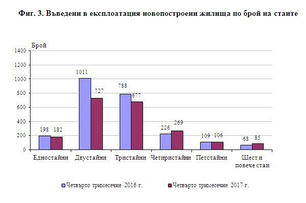 От въведените в експлоатация новопостроени жилищни сгради през четвъртото тримесечие на 2017 г. със стоманобетонна конструкция са 75.0%, с тухлена - 21.5%, с друга - 2.6%, и с панелна - 0.9%. Най-голям е относителният дял на новопостроените къщи (75.9%), следвани от жилищните кооперации (13.5%). През четвъртото тримесечие на 2017 г. в сравнение с четвъртото тримесечие на 2016 г. броят на новопостроените къщи и вили се увеличава, докато броят на новопостроените жилищни кооперации и сградите от смесен тип намалява.