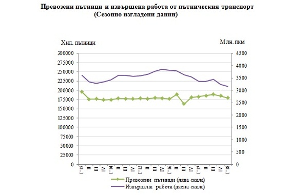 През първото тримесечие на 2018 г. превозените пътници и извършената работа от пътническия транспорт (сухопътен, воден и градски електротранспорт) намаляват съответно с 2.6 и 5.4% спрямо същия период на предходната година.