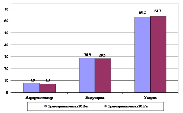 През третото тримесечие на 2017 г. относителният дял на аграрния сектор в добавената стойност на икономиката намалява равнището си с 0.6 процентни пункта спрямо същото тримесечие на предходната година до 7.3%.