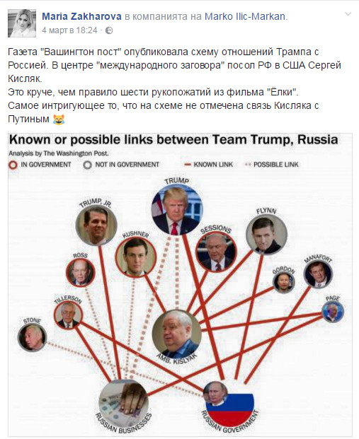 След това на мушката застанаха Джеф Сешънс, зетят на Тръмп и бившият съветник на изборния му щаб Картър Пейдж. Това провокира Мария Захарова да напише във фейсбук, че "разполага с интересна информация за сенаторите, които водят спорове по тази тема". "Струва ми се, че ако обявя всичките контакти на Сергей Кисляк, в САЩ отново ще има гражданска война между Севера и Юга," написа говорителката на Външно.
