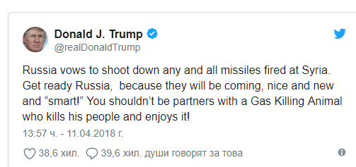 „Русия твърди, че ще свали всички ракети, изстреляни по Сирия. Руснаци, подгответе се, защото ракетите ни идват – хубави, нови и умни. Не бива да си партнирате с животно, което убива хора с отровен газ и се забавлява с това!”, изригна Доналд Тръмп в „Туитър”.