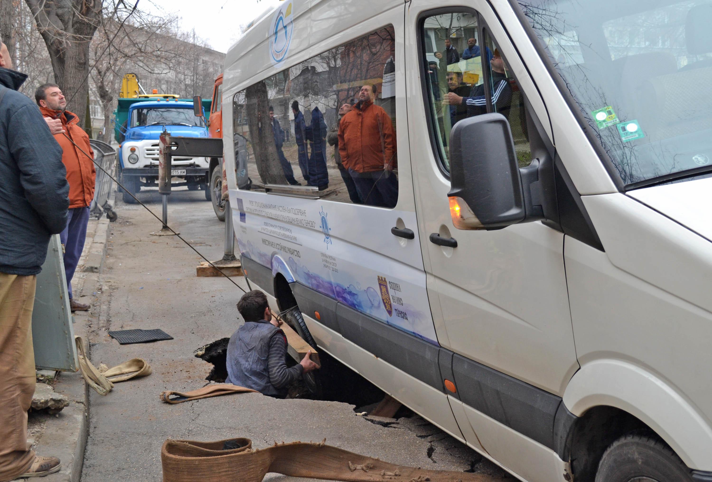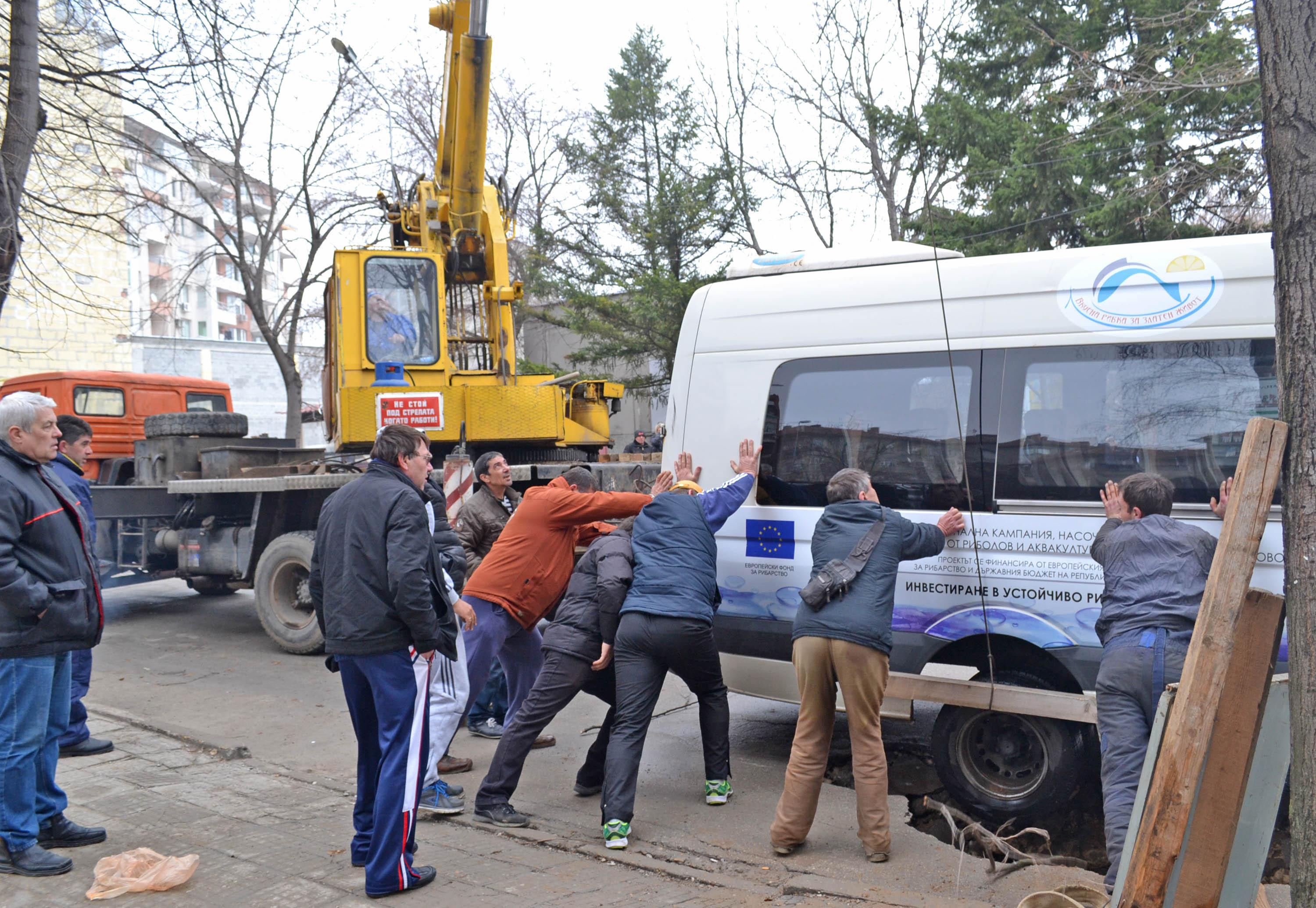 Велико Търново /КРОСС/ Бус пропадна в огромна дупка на ул. "Мармарлийска" във Велико Търново. Инцидентът наложи изваждане на превозното средство с кран.