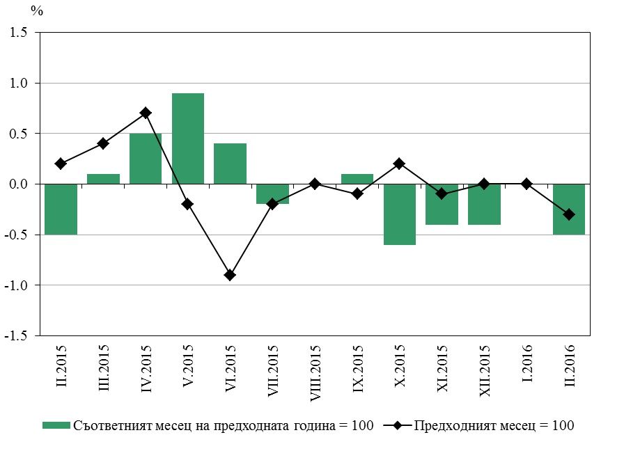2016 г. спрямо февруари 2015 г. е минус 1.0% (табл. 2 от приложението).