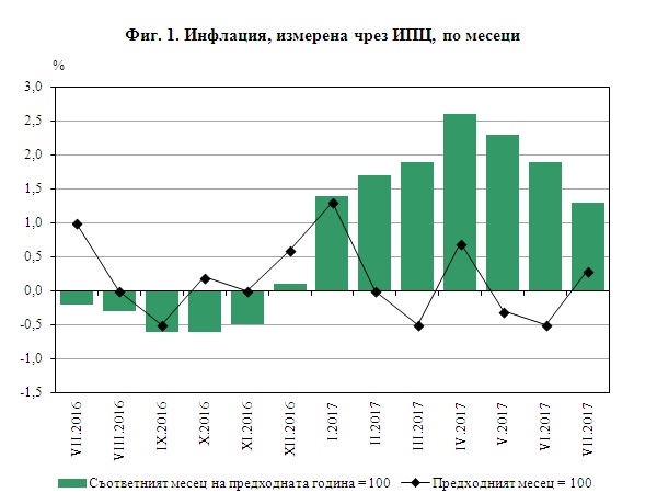Индексът на потребителските цени за юли 2017 г. спрямо юни 2017 г. е 100.3%, т.е. месечната инфлация е 0.3%, сочи изследване на Националния статистически институт. Инфлацията от началото на годината (юли 2017 г. спрямо декември 2016 г.) е 1.0%, а годишната инфлация за юли 2017 г. спрямо юли 2016 г. е 1.3% (фиг. 1, табл. 1 от приложението).