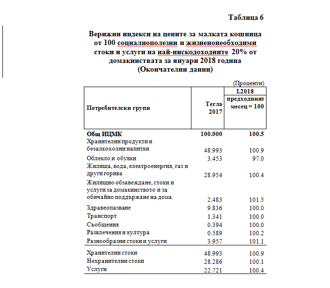 По окончателни данни на НСИ индексът на цените за малката по състав кошница за януари 2018 г. спрямо декември 2017 г. е 100.5% (табл. 6 от приложението).