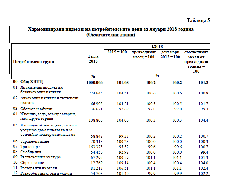 По окончателни данни на НСИ хармонизираният индекс на потребителските цени за януари 2018 г. спрямо декември 2017 г. е 100.2%, т.е. месечната инфлация е 0.2% (табл. 5 от приложението).