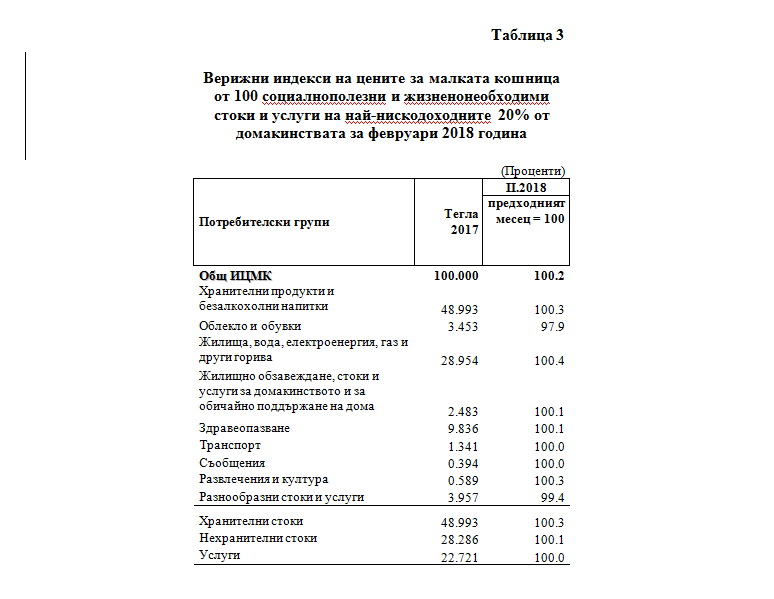 През февруари 2018 г. цените на стоките и услугите от малката кошница за най-нискодоходните 20% от домакинствата са се променили спрямо предходния месец, както следва: