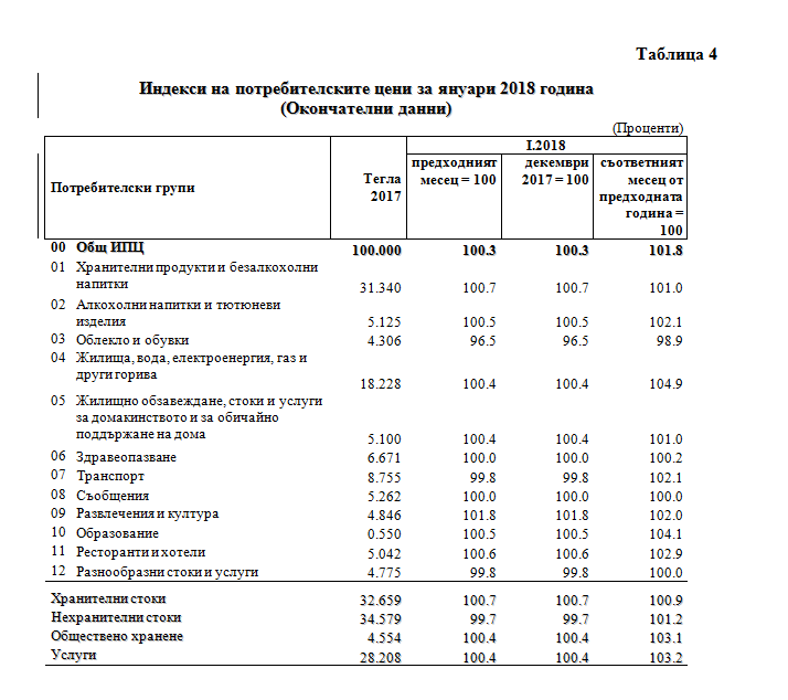 По окончателни данни на НСИ индексът на потребителските цени за януари 2018 г. спрямо декември 2017 г. е 100.3%, т.е. месечната инфлация е 0.3% (табл. 4 от приложението).