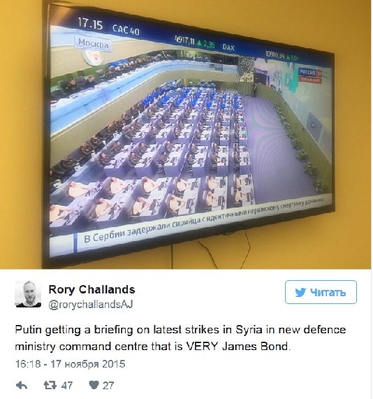 „Новият център по управление на отбраната, където Путин слуша брифинги по нанасяне на авиационни удари по Сирия, сякаш е взет от филмите за Джеймс Бонд”, пише журналист на Al Jazeera в социалната мрежа Twitter.