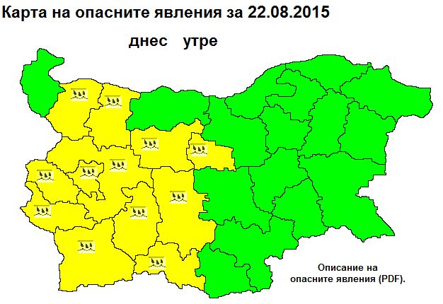 София /КРОСС/ Жълт код за интензивни валежи е обявен за утре в 12 области в Западна България е обявен жълт код за интензивни валежи. Количествата на места ще достигат от 20-40 литра на квадратен метър.