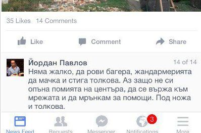 В профила си във Фейсбук Павлов е написал следното: "Няма жалко, да рови багера, жандармерията да мачка и стига толкова. Аз защо не си опъна помията на центъра, да се вържа към мрежата и да мрънкам за помощи. Под ножа и толкова".