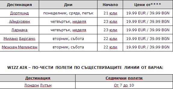 Wizz Air отбелязва обявяването на своята база във Варна със забележителна промоция от минус 20% *** за всички полети до и от България. Това масирано еднодневно намаление *** означава още повече спестени пари за българските клиенти и гостите на страната. Местата могат да бъдат резервирани на цена от EUR 19.99 Евро / BGN 39.99 лева****, до полунощ днес, на wizzair.com.