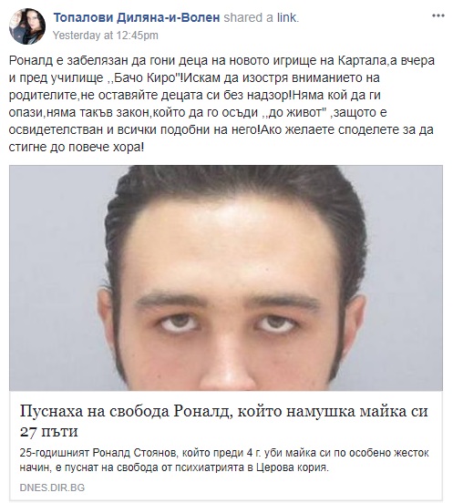 Става въпрос 26-годишния Роналд Стоянов, който през 2012-а уби майка си, след като я намушка 25 пъти. Той обаче беше освидетелстван като невменяем, тъй като страда от шизофрения, заради което стоя само 4 години в психиатрията на затвора в Ловеч, след което бе пуснат през лятото на 2016-а.