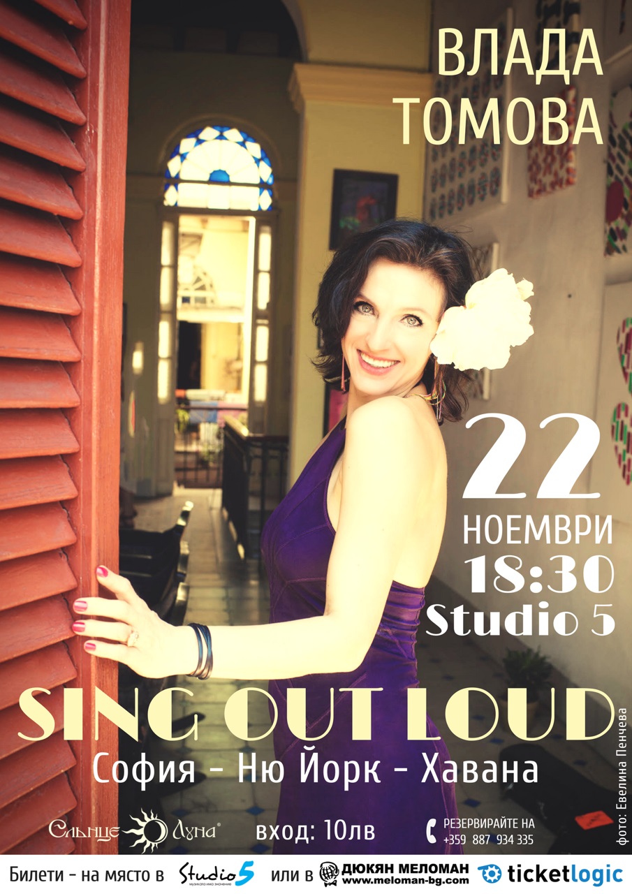 Българската певица, живееща в Ню йорк - Влада Томова ще представи специален, бутиков концерт в София на 22 ноември в "Студио 5". Концертът ще премине под знака на благодарността (в навечерието на Деня на благодарността) преплитайки в програмата си пъстра палитра от музика, визия и емоция. Още на входа гости и приятели ще бъдат посрещнати по стар български обичай - с топла питка-слънце, мед и шарена сол. В концертът Влада ще представи музика от проектите си "Балкански приказки", "Лазарската роза" и любими авторски парчета. Интересна и нетрадиционна, водена от любовта си към България и любопитството си към света, певицата ще представи и новото си видео към песента "SING OUT LOUD". То е заснето в Куба по-рано тази година и типично в музикалния стил на Влада, представлява смесица от различни култури, прекрасна емоция и енергия, автентични пъстри кадри от днешна Хавана и много усмихнати лица. Специално за вечерта е подготвена и мултимедия с цветни снимки-спомени на певицата от скорошното й посещение в Хавана. Тя бе там по повод предстоящият й самостоятелен концерт в рамките на фестивала "Куба Диско" /Кубинските Грамита/.