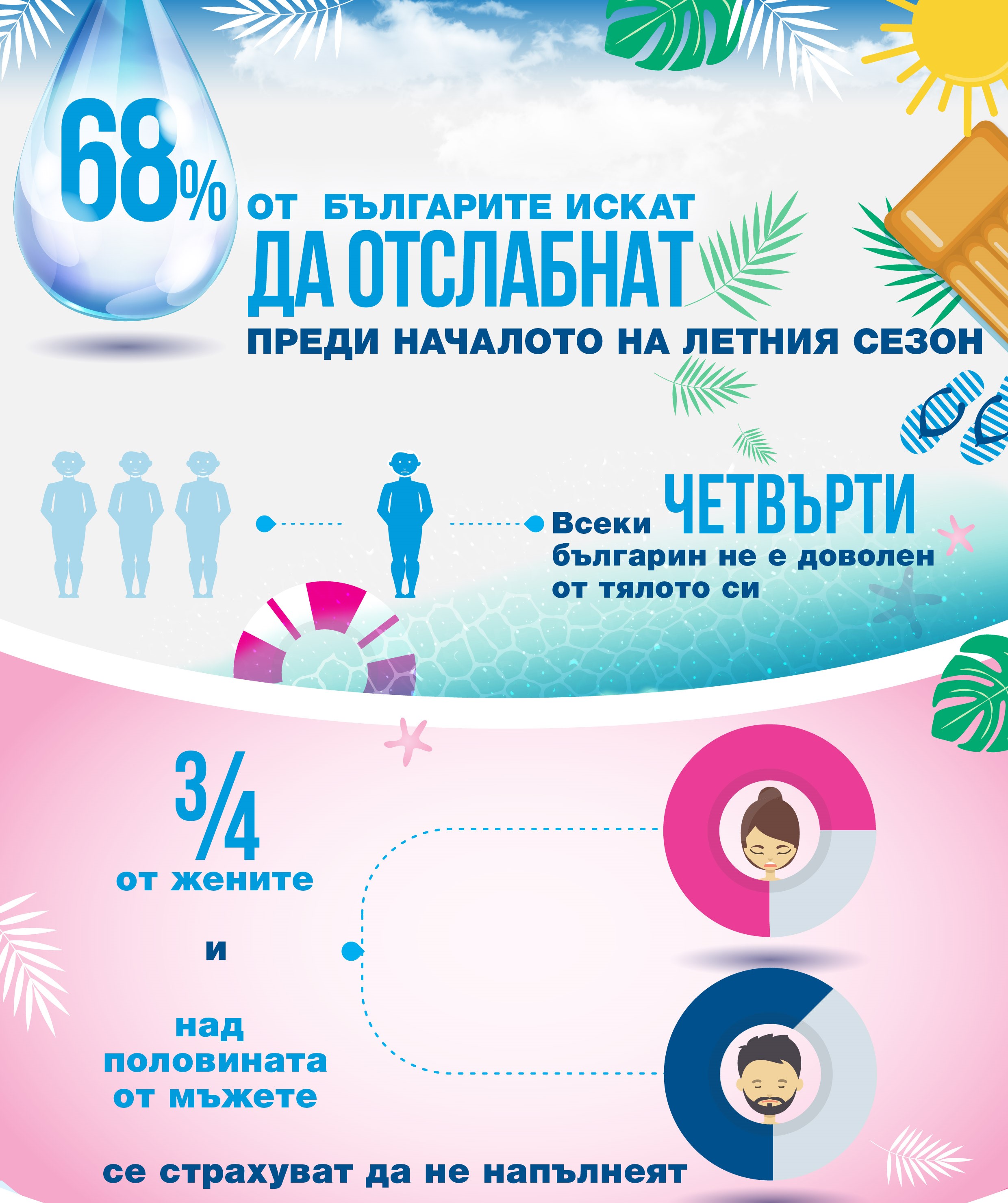 /КРОСС/ 68% от българите признават, че биха искали да отслабнат, за да посрещнат летните месеци в добра физическа форма. Всеки четвърти българин не е доволен от тялото си, показват данни от проучване на Алфа Рисърч, проведено през май 2017 г. сред градското население в България.