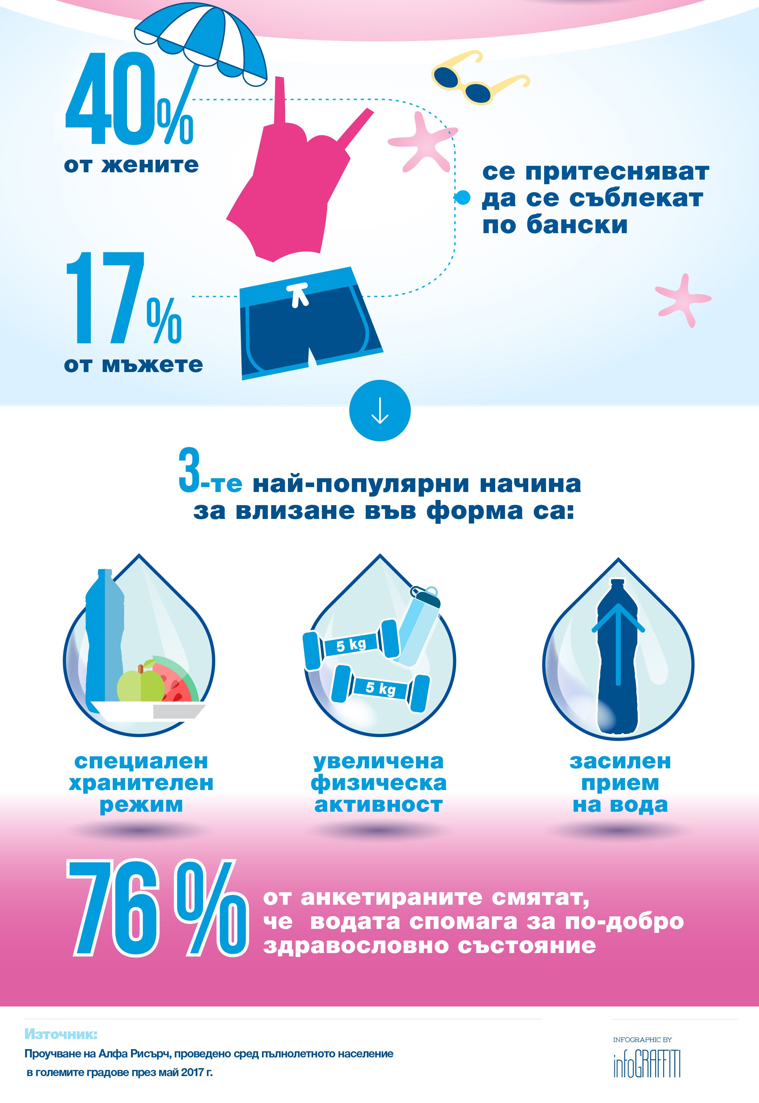 Според д-р Стоянова, засиленият прием на вода не само пречиства организма, но води до подобряване на настроението и самочувствието. А кога, ако не през лятото, да се насладим на перфектната си форма?