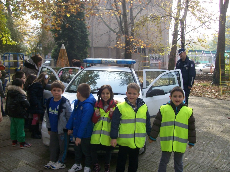 Децата се запознаха с униформата на полицая, отличителните знаци, служебната карта, радиостанцията, стоп-палката и други. Като "свидетели" те показаха, че са добри в наблюдението и демонстрираха отлични познания за това кога и как да потърсят помощ от полицията и как да подадът сигнал на тел. 112. В края на демонстрацията полицейските инспектори им връчиха Удостоверения. Всеки малчуган получи и русунка за индивидуална работа - оцветяване и изрязване. Преди раздялата малките приятели на полицаите извършиха "щателна проверка" на служебния полицейски автомобил, с който униформените бяха пристигнали.