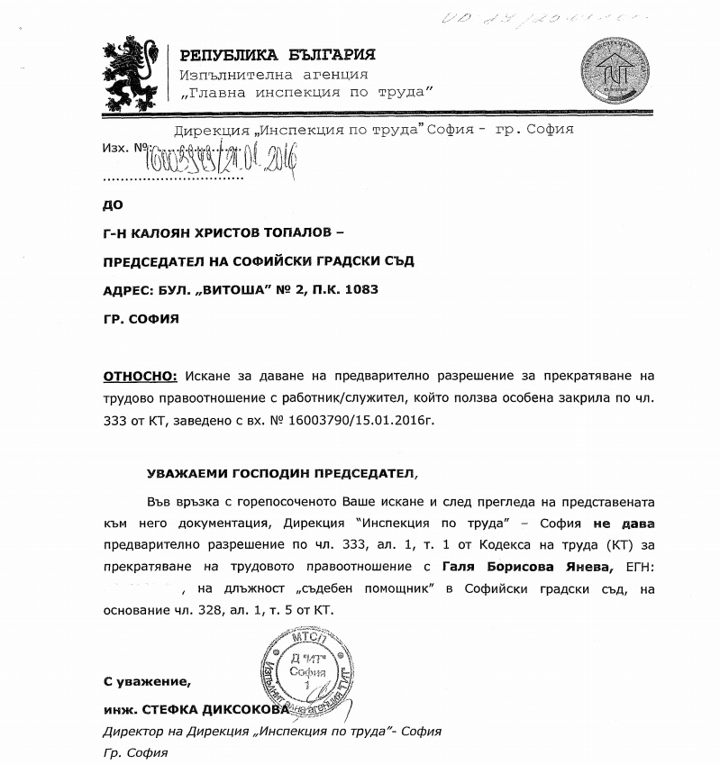 /КРОСС/ „Във връзка с журналистически въпроси относно съдебните помощници, които не издържаха атестационния тест, уточняваме, че днес в Софийски градски съд бяха получени три писма от Дирекция „Инспекция по труда" - София. С тях без каквато и да е било мотивация Инспекцията по труда не дава разрешение за прекратяване на трудовото правоотношение с Галя Янева, Радка Дончева и Доника Лазарова.