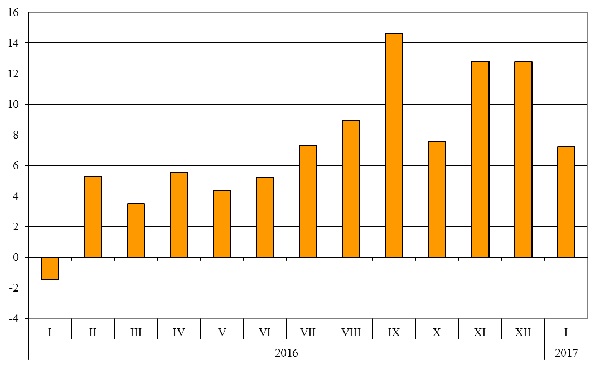 При износа на България за ЕС, разпределен според Стандартната външнотърговска класификация, през януари 2017 г. в сравнение със същия месец на предходната година най-голям ръст е отбелязан в секторите „Мазнини, масла и восъци от животински и растителен произход" (48.6%) и „Минерални горива, масла и подобни продукти" (44.6%). Най-голям спад се наблюдава в сектор „Безалкохолни и алкохолни напитки и тютюн" (10.7%).