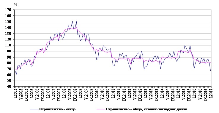 През януари 2017 г. индексът на произведената строителна продукция, изчислен от сезонно изгладени данни, е под равнището от предходния месец, като продукцията от сградното строителство намалява с 1.3%, докато гражданското/инженерното строителство бележи увеличение с 0.2%.