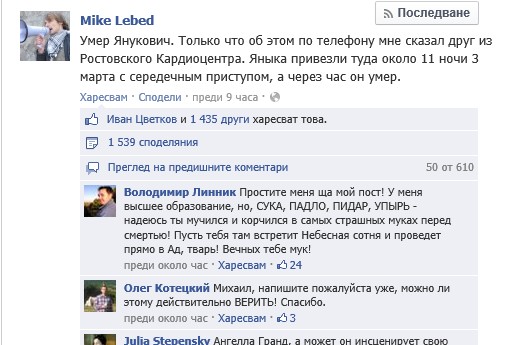 Пръв разпространи вестта Михаил Лебед в профила си във фейсбук. "Умря Янукович. Току-що ми го съобщи приятел от кардиологичния център в Ростов. Докараха Яник (така наричат Янукович - бел. ред.) там около 11 ч вечерта на 3 март със сърдечен пристъп, а след един час той умря", гласеше съобщението.