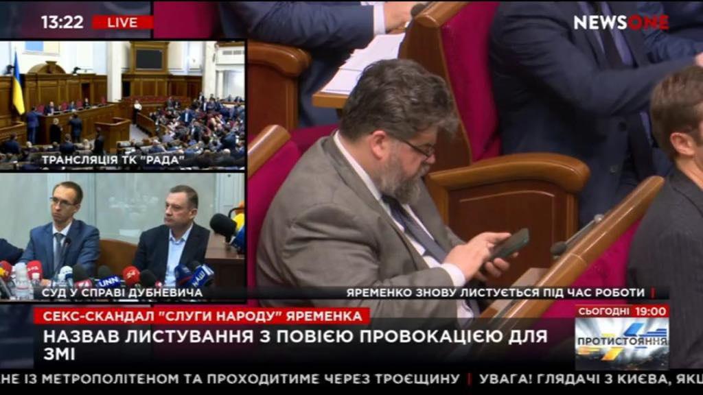 /КРОСС/ Скандал разтърси управляващите в Украйна. В центъра му се оказа председателят на Комисията по външна политика Богдан Яременко. По време на пленарно заседание журналисти заснемат кореспонденцията му с компаньонка.
