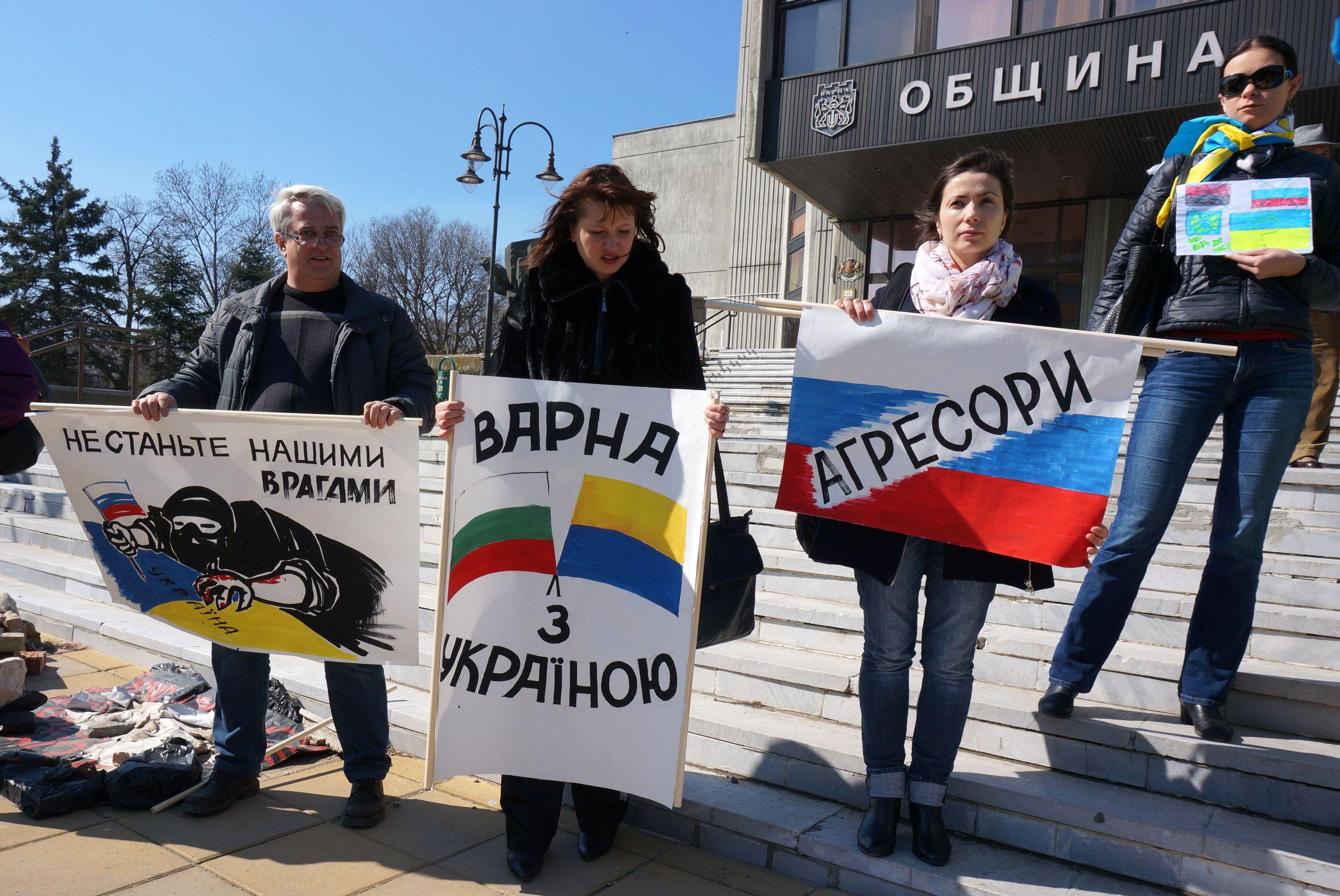 Варна /КРОСС/ Украински граждани, живеещи в България, се събраха пред Община Варна на протест срещу намесата на Русия в Крим.