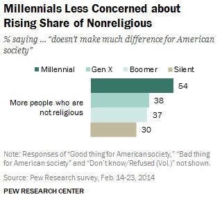 Освен това изследователите отбелязват, че новото поколение е значително по-толерантно по ред социални въпроси като аборти, расово смесени бракове, атеизъм, еднополови бракове, узаконяване на нелегални имигранти, потребление на марихуана и е по-малко ентусиазирано на тема патриотизъм. Същевременно в политическите си възгледи е значително „по-прогресистко", определя себе си като „независими" и е по-склонно да гласува за Демократическата партия, отколкото за Републиканската.