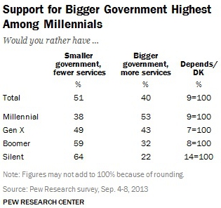 /КРОСС/ В САЩ Генерацията „Милениум" - хората между 18 и 33 г. - са по-големи привърженици на държавната намеса и обществените услуги, отколкото предишните поколения. Помолени да изберат между „по-малко държава и по-малко обществени услуги" и „повече държава и повече обществени услуги", само 38% посочват първия вариант, а мнозинство от 53% - втория. Това бележи преобръщане на нагласите по този въпрос, в сравнение с по-старите поколения. Например при „Поколение X" (родени през 60-те-70-те) съотношението на двата отговора е 49% на 45%, а при следвоенното поколение („Бумъри"), е 59% на 32%. За тези тенденции свидетелстват данните на известния американски „тръст за факти" Pew Research Center от национално представително изследване сред 1821 пълнолетни американци, проведено през 2014 г.