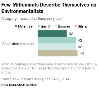 Донякъде неочаквано, делът на тези, които определят себе си като „защитници на околната среда" е с 10% по-нисък, отколкото при по-възрастните - 32% срещу 42%. (Това е учудващо, тъй като тъкмо в последното десетилетие зачестиха екстремните атмосферни явления, които бяха предсказвани във връзка с „парниковия ефект" от въглеводородната икономика. Анализаторите не предлагат обяснение на тази промяна. Тъкмо в този период се разгърнаха и корпоративно-научните „изследвания", отричащи глобалното затопляне.)
