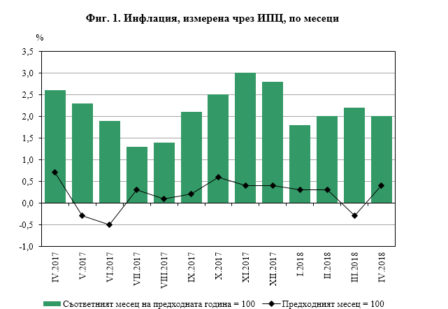 Хармонизираният индекс на потребителските цени за април 2018 г. спрямо март 2018 г. е 100.3%, т.е. месечната инфлация е 0.3%. Инфлацията от началото на годината (април 2018 г. спрямо декември 2017 г.) е 0.6%, а годишната инфлация за април 2018 г. спрямо април 2017 г. е 1.7% (табл. 2 от приложението).